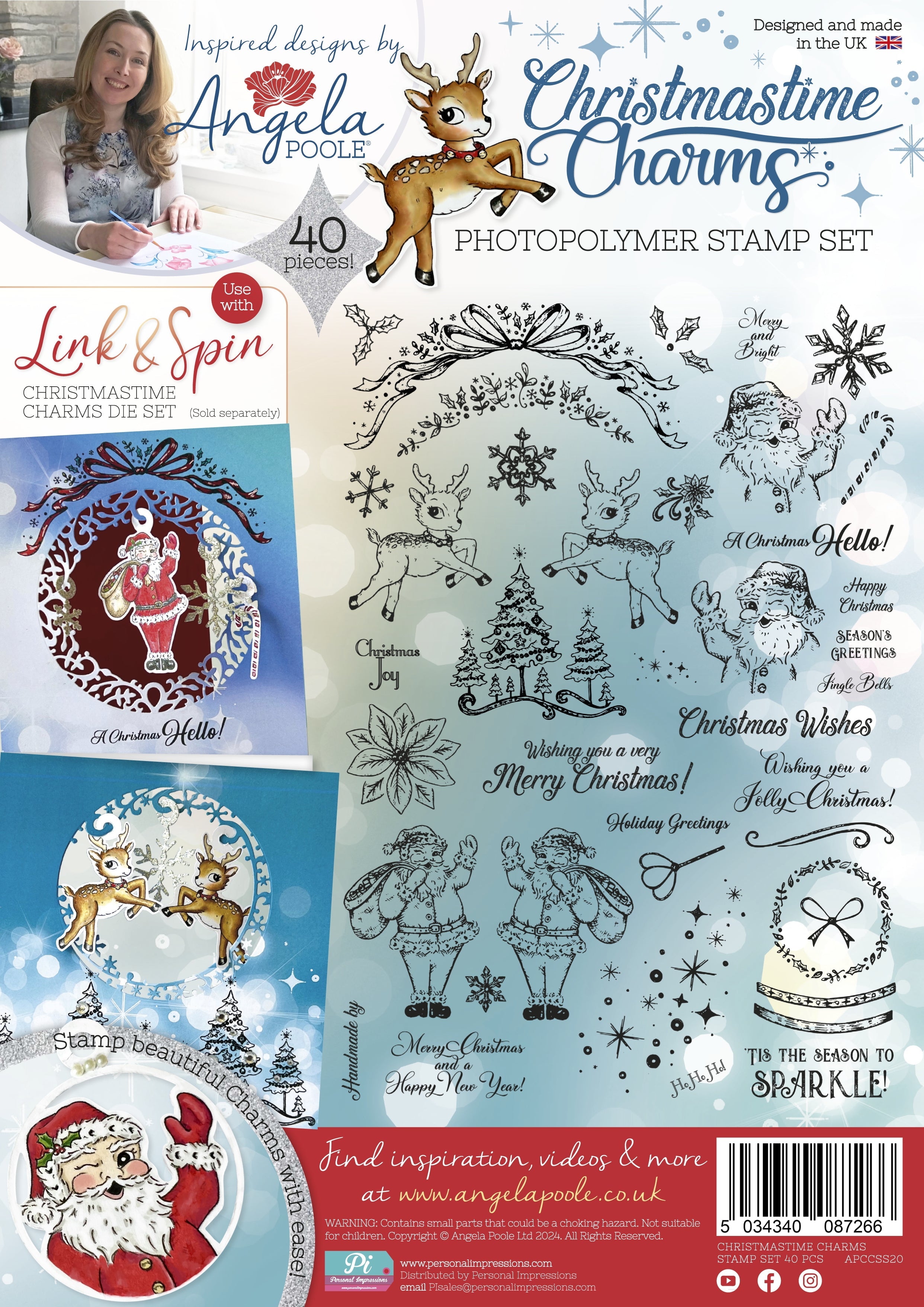 This beautiful stamp set includes hand-drawn stamps by Angela! The set includes 40 stunning designs, including retro waving Santa, reindeer, Christmas trees, greetings and more. The set is designed to work perfectly with our Link & Spin Christmas Time Charms die set, for incredible Christmas projects!