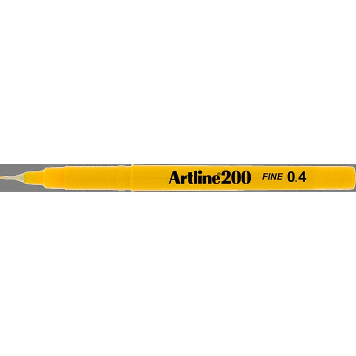 Artline EK200 Yellow 0.4 pen. The Artline 200 fine pen is a high quality popular fineline pen with a 0.4mm needle point tip. Its ink is Xylene free, water based, instant drying and smear resistant. Available with a choice of 12 ink colours Artline 200 fine 0.4 pens are Ideal for all general purpose writing at the office, in school or at home.
