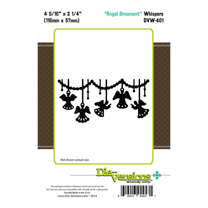 Die-Versions - Whispers - Angel Ornament. Die Size 4 9/16 x 2 1/4, 116x57mm Die-Versions are thin, chemically-etched metal dies, used to cut out letters and shapes from a variety of materials. They are designed to cut cardstock, vinyl, vellum, foam, thin chipboard, cork, metallic paper, felt and more. Each die comes with a piece of ejection foam.