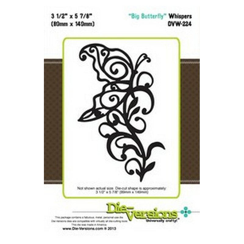 Whispers - Big Butterfly. Contains 1 piece measuring 89mm x 149mm. Die-Versions are thin, chemically-etched metal dies, used to cut out letters and shapes from a variety of materials. They are designed to cut cardstock, vinyl, vellum, foam, thin chipboard, cork, metallic paper, felt and more. Each die comes with a piece of ejection foam.
