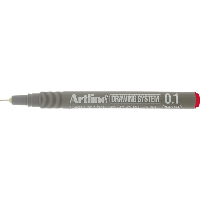 EK231 0.1 Drawing Pen Red. Artline drawing system pens are a professional pen for technical drawing, illustration & graphic design. The pens contain a water based pigment ink that is acid & Xylene free which is also highly water resistant and fade proof. A friction proof nib enables Artline drawing pens to provide a consistent line width. It is protected with a metal reinforced collar for added strength. This also allows the pen to be used with rulers and stencils without causing any damage to the nib. Artline drawing system pens have nine different nib widths which are 0.05mm, 0.1mm, 0.2mm, 0.3mm, 0.4mm, 0.5mm 0.6mm, 0.7mm & 0.8mm.
