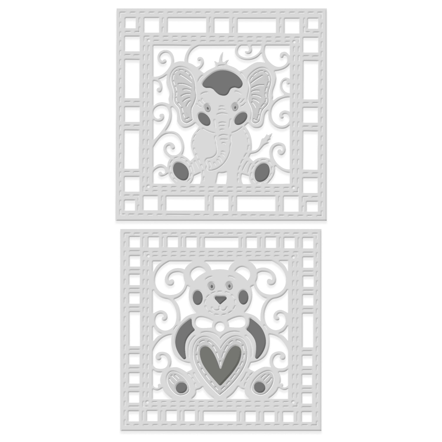 Two Patchwork Quilt square backgrounds - one with an Elephant centre piece; one with a teddy centre piece. This dies cuts, embosses and scores. Fits almost all of the leading die cutting machines.
