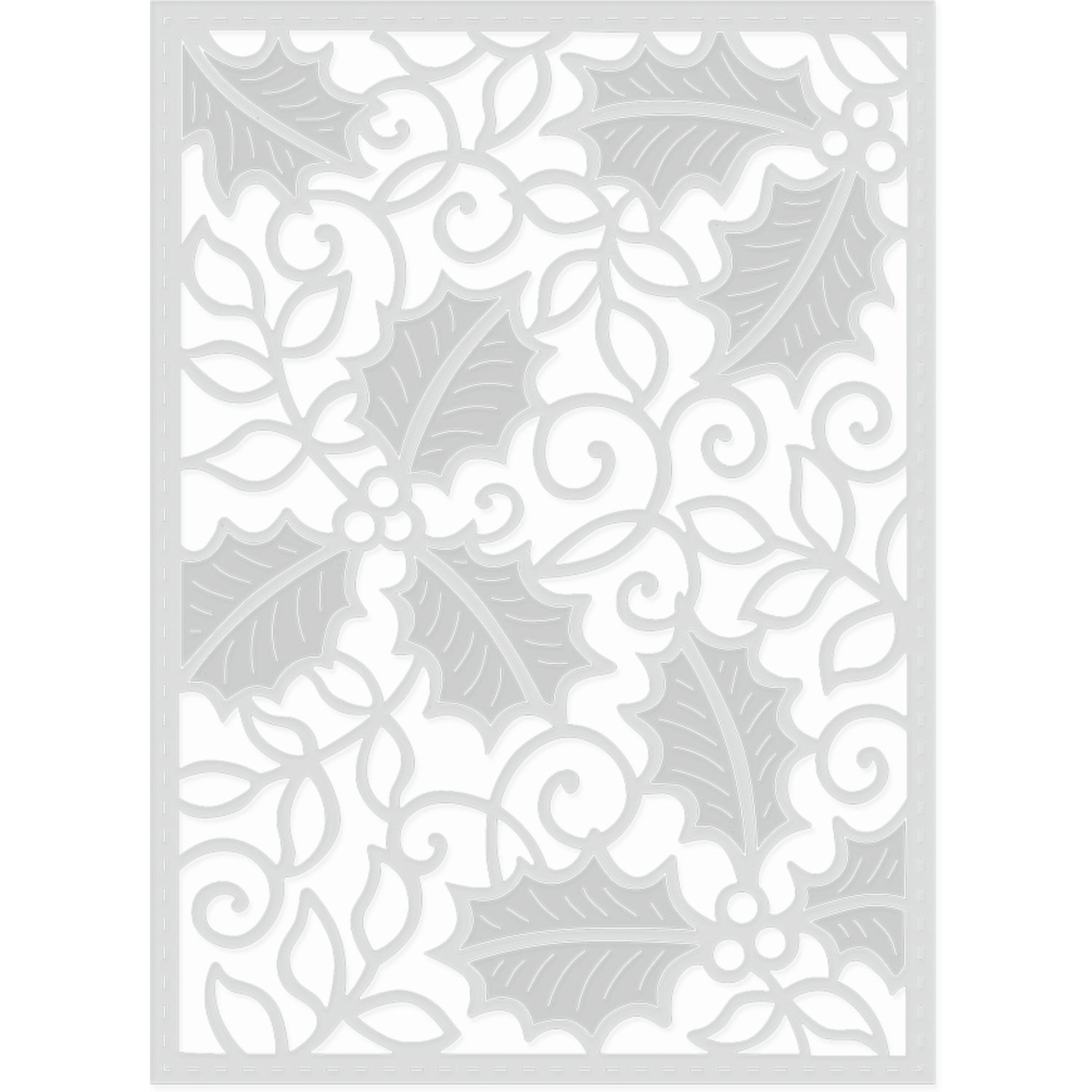 Holly Background. Christmas Holly Background Die including a pretty holly leaf, berry and swirl design. This dies cuts, embosses and scores. Fits almost all of the leading die cutting machines. Width is circa 110mm edge to edge.