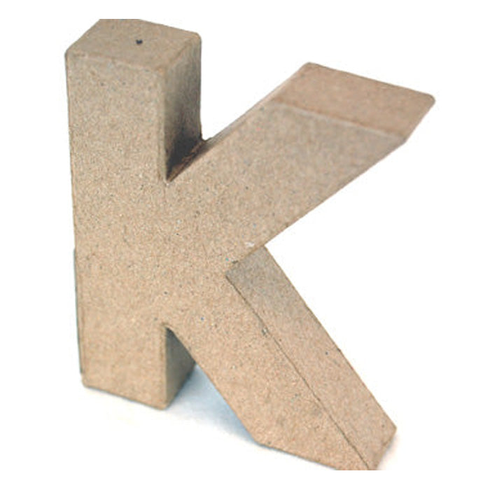Papier Mache Letter K Our own-brand range of biodegradable low-cost papier mache shapes (made from recycled waste products e.g. old newspapers cardboard etc) have been hand-made using 100% recycled materials and organic glue. The designs are supplied in a buff or manila colour ready to paint or decorate with acrylics inks poster paints stamps polymer clay foam clay decoupage (or Decopatch) papers napkins glitters embelishments beads fabric and much more. Dimensions: 10cm - 4 Sold in PACKS OF 5 We also supply 20.5cm medium letters under product code CLP2001 to CLP2026 in packs of 3 and have had them made as 3D boxes in packs of 3 under product codes CLP2301 to CL2326.
