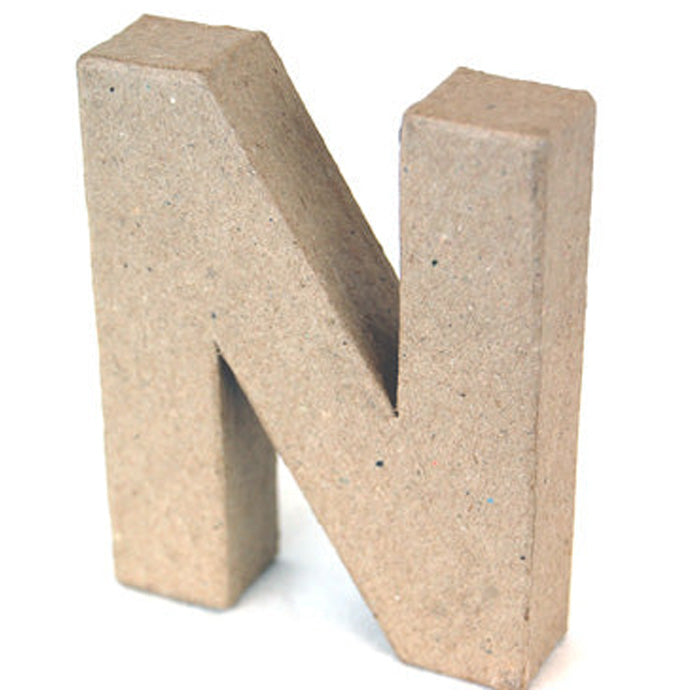 Papier Mache Letter N Our own-brand range of biodegradable low-cost papier mache shapes (made from recycled waste products e.g. old newspapers cardboard etc) have been hand-made using 100% recycled materials and organic glue. The designs are supplied in a buff or manila colour ready to paint or decorate with acrylics inks poster paints stamps polymer clay foam clay decoupage (or Decopatch) papers napkins glitters embelishments beads fabric and much more. Dimensions: 10cm - 4 Sold in PACKS OF 5 We also supply 20.5cm medium letters under product code CLP2001 to CLP2026 in packs of 3 and have had them made as 3D boxes in packs of 3 under product codes CLP2301 to CL2326.