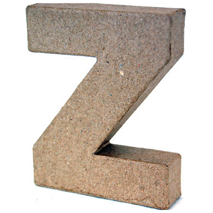 Papier Mache Letter Z Our own-brand range of biodegradable low-cost papier mache shapes (made from recycled waste products e.g. old newspapers cardboard etc) have been hand-made using 100% recycled materials and organic glue. The designs are supplied in a buff or manila colour ready to paint or decorate with acrylics inks poster paints stamps polymer clay foam clay decoupage (or Decopatch) papers napkins glitters embelishments beads fabric and much more. Dimensions: 10cm - 4 Sold in PACKS OF 5 We also supply 20.5cm medium letters under product code CLP2001 to CLP2026 in packs of 3 and have had them made as 3D boxes in packs of 3 under product codes CLP2301 to CL2326.