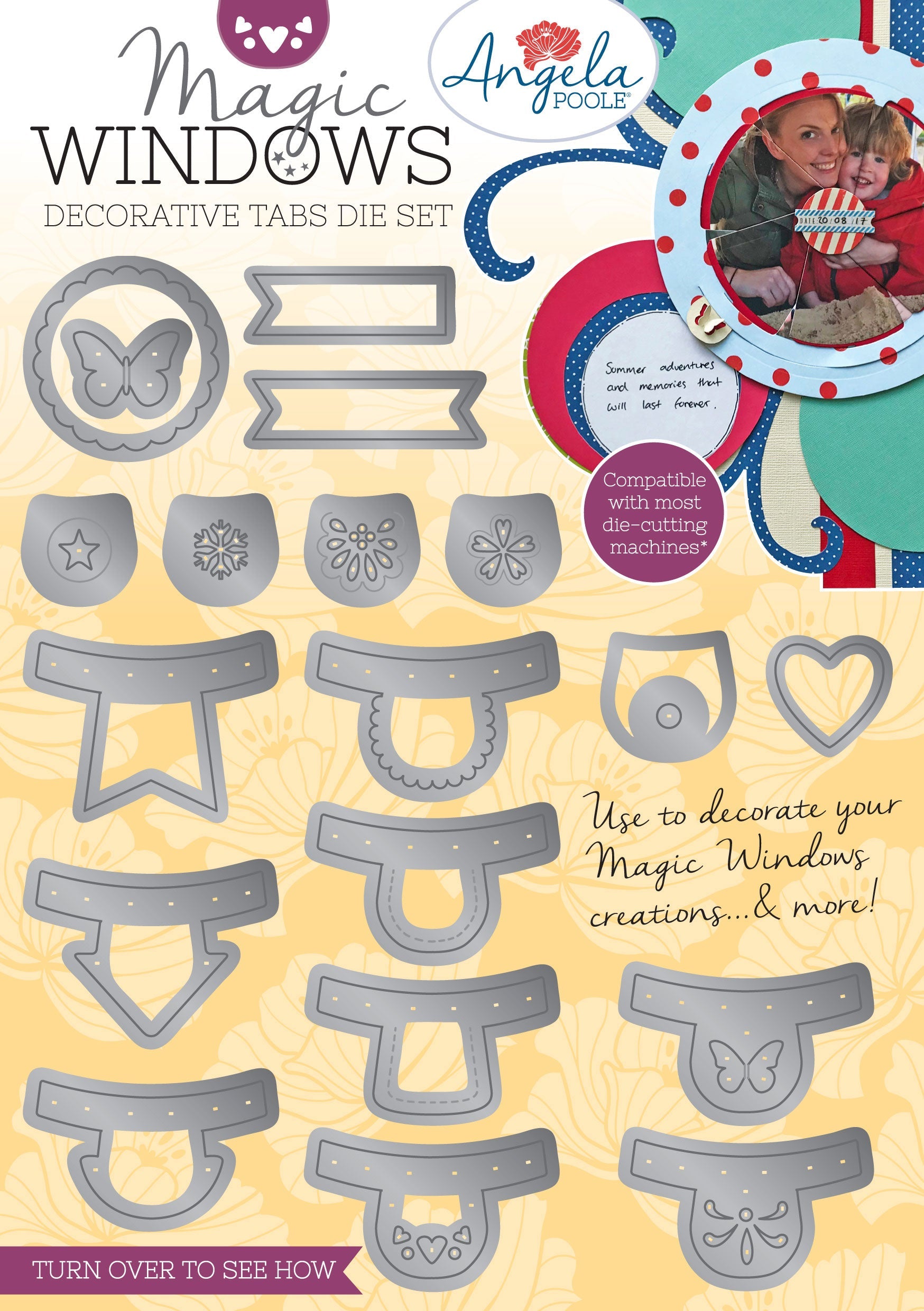 The Magic Windows Decorative Tabs Die Set includes 19 dies, enabling you to customise your Magic Windows tabs with pretty tab overlays, ribbon and more. You’ll also find elements for embellishing your Circle Topper, and banners for personalising cards and scrapbook layouts.