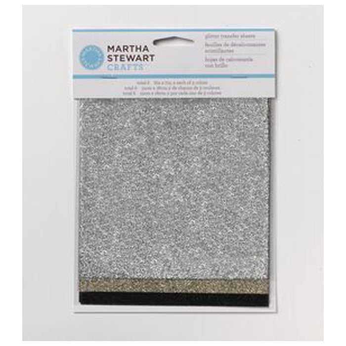 Martha Stewart Glitter Sheets- Mineral. Use with transfer adhesive to add sparkle. Apply adhesive to project when dry use stylus or fingers to burnish lining side of glitter sheet. Contains 2 ea. 6in x 7in sheets of 3 colors: silver gold black.