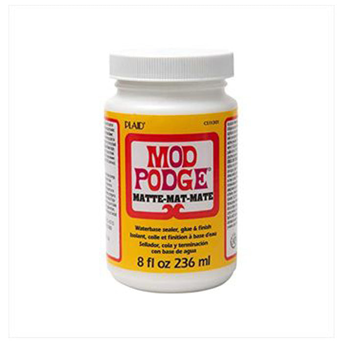 Mod Podge Matte. Mod Podge is quick-drying for multiple coat build up and dries clear. It can be sanded to a smooth finish, and cleans up easily while wet with simple soap and water. Certified AP non-toxic; water-based.