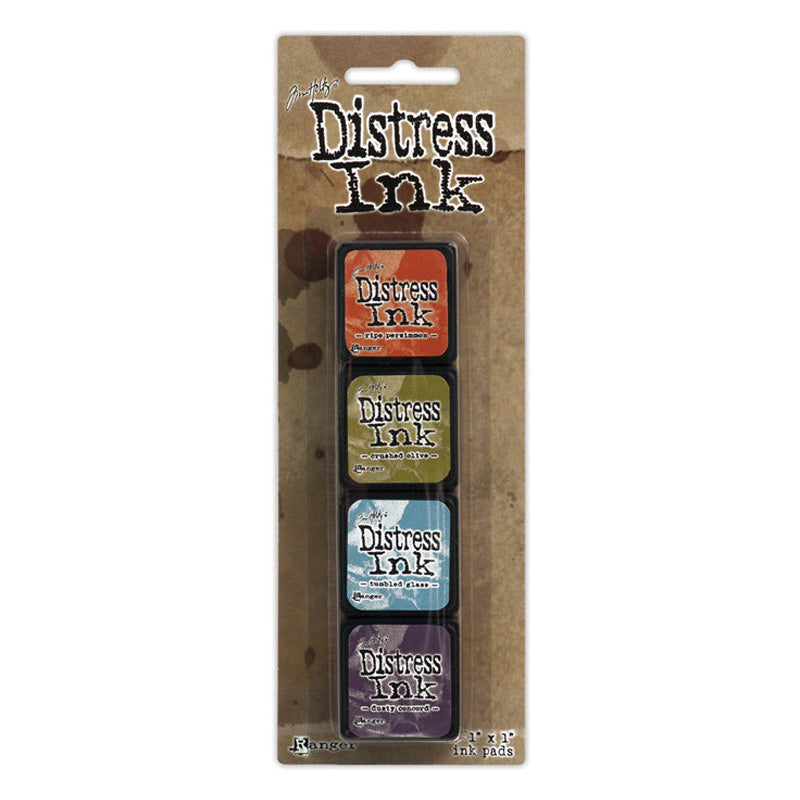 Kit 8 (Includes Ripe Persimmon, Crushed Olive, Tumbled Glass and Dusty Concord). Add to your growing collection of convenient stackable 1x1 pads with 3 more versatile kits. TIM HOLTZ MINI DISTRESS INK PADS have a raised felt surface and coordinates with the Distress palette of products.