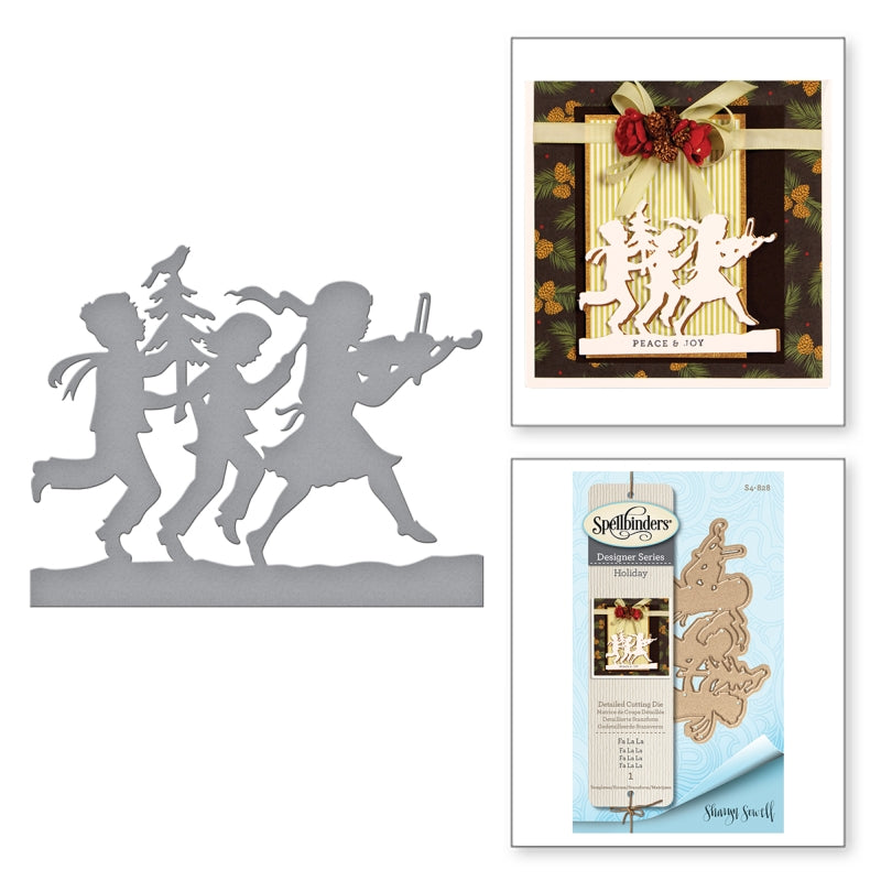 Shapeabilities Fa La La by Sharyn Sowell Etched Dies is a set of one with a sweet silhouette of children dancing to holiday music! Spellbinders Shapeabilities cut, deboss, emboss and stencil with a single etched die template.