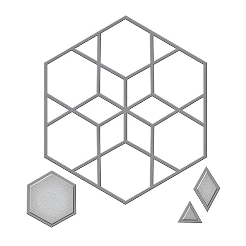 This four piece die set includes two hexagon shapes, a diamond and triangle shapes. The largest hexagon die uniquely has a flower in its centre.