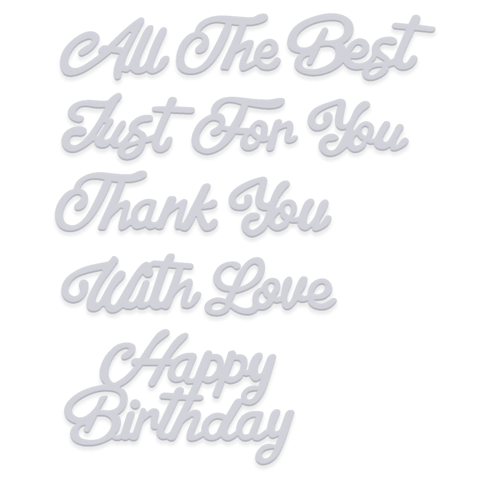 A selection of sentiment word dies (6 dies but 12 die cuts) as follows: Congratulations, All The Best, Just For You, Thank You, With Love, Happy Birthday.