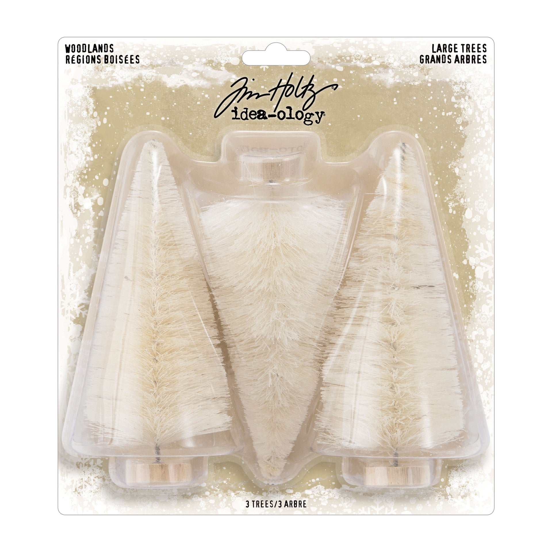 Large in size and merry in spirit, these Woodland Lot Large trees will do the job in all of your Christmas crafts. These trees come in three so you can have three times as much the holiday spirit creating your crafts. Measure 5" in height Create an ornament, add to a gift, or create a miniature wonderland in your Tim Holtz Vignette Box. Trees can be colored with inks or stains Natural on wire with wood base 3 trees