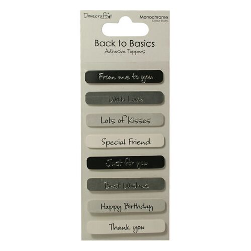 Toppers. 8 adhesive toppers in Monochrome colours, featuring charming sentiments to add a personal touch to your project.