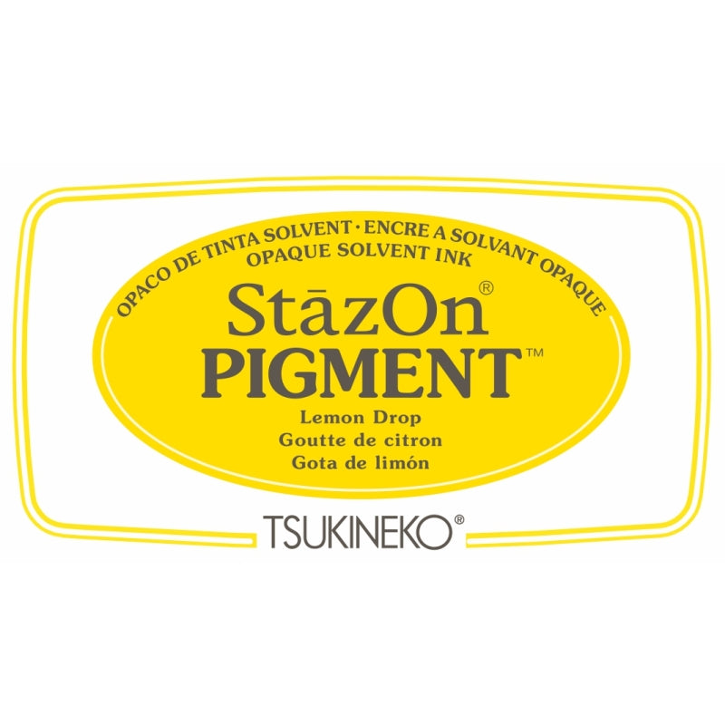 Stazon Pigment Ink Pad Lemon DropOpaque Solvent Ink, For use on non-porous surfaces such as plastic, metal, glossy papers and more. Drying time varies by surfaceand amount of ink applied. Keep pad covered when not in use. Ink Pad size - 75 x 35mm - Case 96 x 56mm