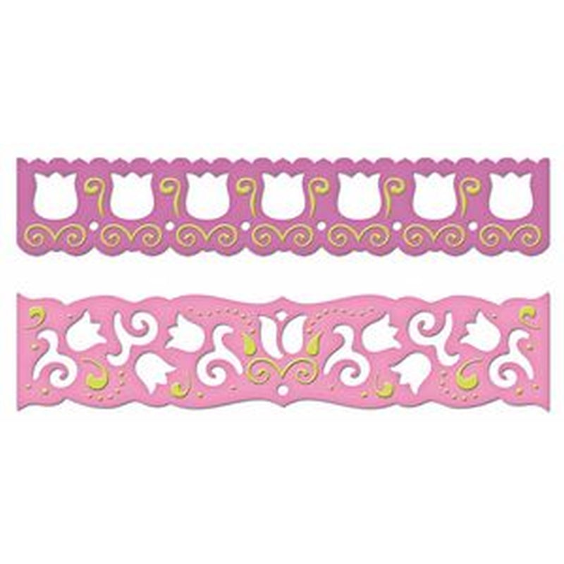 Tulips Pendants Borderabilities. A tulip is a symbol of abundance and indulgence, it is easily recognized and much loved. The beauty and simplicity of a tulip is conveyed to art with this elegant set of Borderabilities. Designed to coordinate with S4-209 Tulips Pendants. Sized for an A2 card, this is a set of two Borderabilities die templates. One is a border that cuts one edge and embosses the other, and can be used to make continuous cuts and decorative edges. The second Borderabilities die template has a continuous cut line perfect for making coordinating accent pieces. Spellbinders Borderabilities cut, emboss and stencil with a single die template. Approximate Die Template Sizes: Border: 7/8 x 5? Accent: 1 1/8 x 5?